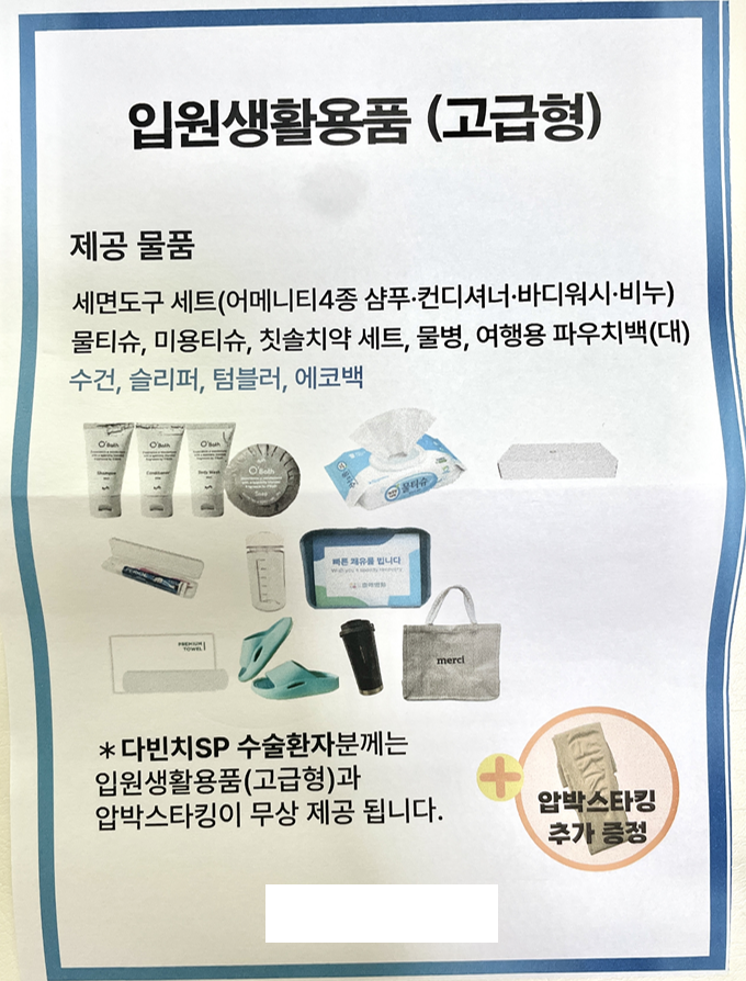 저는 로봇수술이라 병원에서 입원생활용품과 압박스타킹을 증정한다고 하네요.